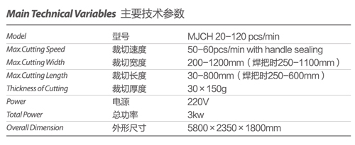 The machine is currently the most advanced non-woven cutting machine in our domestic market.It can seal the handle in theprocess of cutting and with the 50-60pcs per minute of sealing,it can save labor,improve the fficiency and decrease the productivity cost.Professionally it is applicable to non-woven fabric cutting and folding,embossing,welding at one time as well,besides,it can be used for thin film,paper cutting materials.It is widely used in non-woven bag industry.The machine is equipped with edge-folding.ultrasonic welding and slicing function which has such advantages like easy operation,high cutting accuracy,stable mechanism,low voice and so on.The motor frequency control the speedand count automatically.It can stop with alarm and has the function oftension control.It adopts the heavy andadvanced knife to cut to make the fabric even without edge.